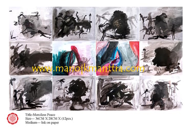 The image showcases a collection of 12 abstract paintings, each with its own unique style and expression. The paintings are arranged in a grid, with a mix of black, white, and colorful hues. The dominant use of black and white creates a sense of contrast and highlights the expressive brushstrokes and textures. Abstract painting is a style of art that emphasizes the process of creating art rather than representing a realistic image. It often involves using bold colors, textures, and non-representational forms to evoke emotions and ideas. The paintings in the image appear to be created using a combination of pen and ink on paper, which allows for a range of expressive techniques. The title "Merciless Peace" suggests that the paintings may be exploring themes of conflict, tension, or unease. The use of dark colors and abstract forms creates a sense of intensity and drama, while the varied brushstrokes and textures add a sense of energy and movement. Overall, the image presents a thought-provoking and visually striking collection of abstract paintings that invite the viewer to interpret and reflect on their meaning.