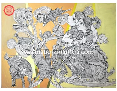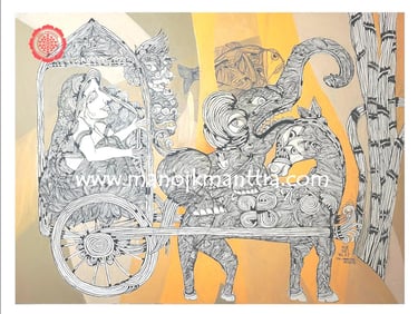 Abduction of Mata Sita by Ravana 2026The painting by artist Manojkumantra is titled "Kasturi Mrig" (Musk Deer) and depicts the pivotal moment that leads to the abduction of Sita in the Hindu epic the Ramayana. In the image, Sita is pointing out the beautiful, golden deer to Rama and Lakshmana, who are at their forest dwelling