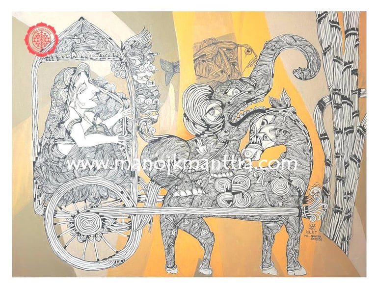The painting you provided by artist Manojkumantra is indeed titled the Abduction of Sita, depicting a key scene from the Hindu epic the Ramayana.The epic describes the demon king Ravana, motivated by revenge and lust, abducting Sita from the Panchavati forest after luring her husband Rama and his brother Lakshmana away with a magical golden deer disguise